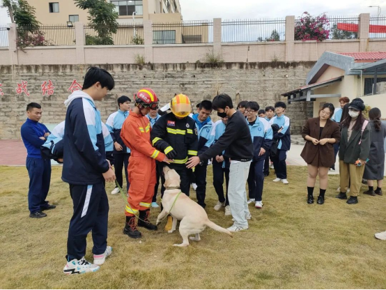 消防站工作人員向師生們詳細(xì)介紹了搜救犬訓(xùn)練基地的基本情況,特別介紹了消防搜救犬,包括種類要求、日常訓(xùn)練及其生活環(huán)境等。它們是消防員的“無言戰(zhàn)友”,救援現(xiàn)場的“特種兵”,是有特異功能的搜救英雄。隨后師生們觀摩了搜救犬的障礙、服從訓(xùn)練,走鋼絲、鉆洞、跳躍等,敏捷的身姿贏得師生們的一陣陣喝彩。最后,在訓(xùn)導(dǎo)員帶領(lǐng)下,與搜救犬進(jìn)行友好互動,親身體驗(yàn)了搜救犬訓(xùn)導(dǎo)員與搜救犬的工作日常。