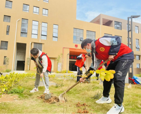 青年志愿,為綠充“植”。師生齊聚,相互協(xié)作,個個干勁十足,解袋、扶苗、填土、施肥、澆水,將一棵棵充滿生機和希望的小樹植入大地,校園呈現(xiàn)出一派熱火朝天的勞動景象。