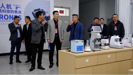 視察組一行在郭守強(qiáng)理事長及鄭乃吉校長的帶領(lǐng)下參觀了我校飛機(jī)維修實訓(xùn)室、機(jī)電一體化實訓(xùn)室、眼視光實訓(xùn)室、無人機(jī)實訓(xùn)室等各專業(yè)實訓(xùn)室及航空研學(xué)館,并實地察看我校產(chǎn)教融合中心的建設(shè)進(jìn)度。