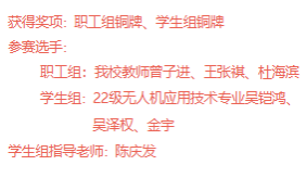 自受領(lǐng)承辦任務(wù)以來,我校高度重視,從賽前調(diào)度、工作籌備到賽場布置、志愿服務(wù)等各項(xiàng)工作,為參賽選手們搭建了切磋技藝、展示技能的平臺,確保了競賽的順利進(jìn)行;參賽選手則嚴(yán)格按照大賽規(guī)定和要求積極備賽,強(qiáng)化系統(tǒng)專業(yè)的培訓(xùn),最終在與來自泉州市各大中專院校、企業(yè)的優(yōu)秀選手同場競技中取得佳績。本次賽事是我校無人機(jī)技術(shù)應(yīng)用專業(yè)淬煉技能水平、檢驗(yàn)育人成果的一次見證,也是我校辦學(xué)實(shí)力、賽事舉辦能力的一次檢驗(yàn),充分體現(xiàn)我校師生朝氣蓬勃的精神風(fēng)貌。
