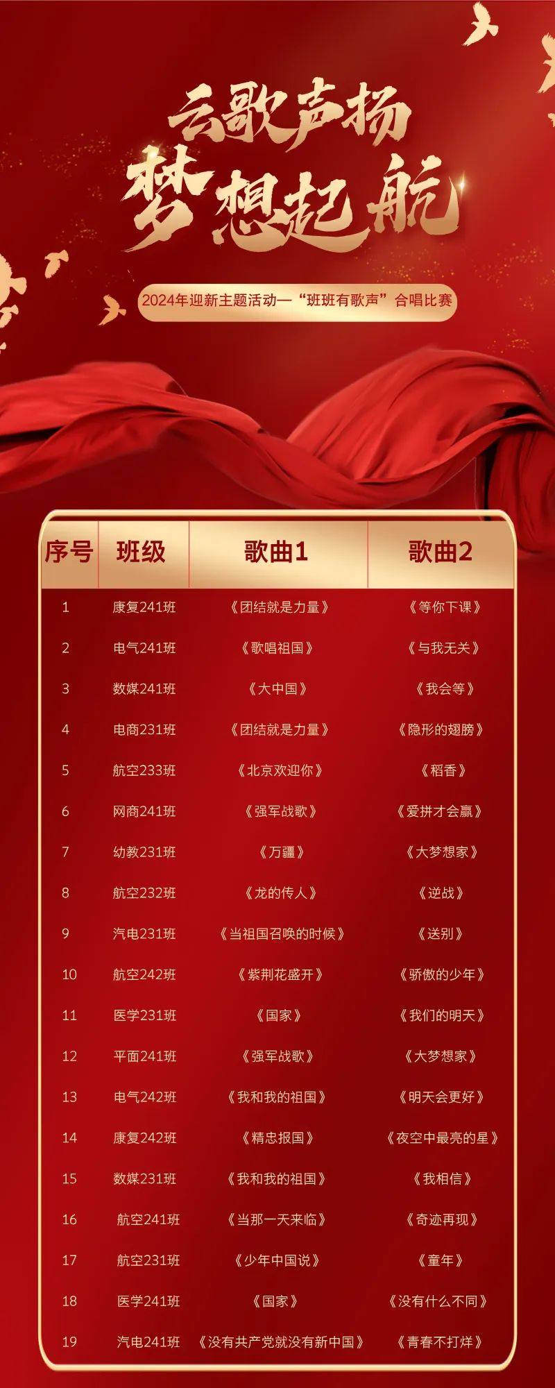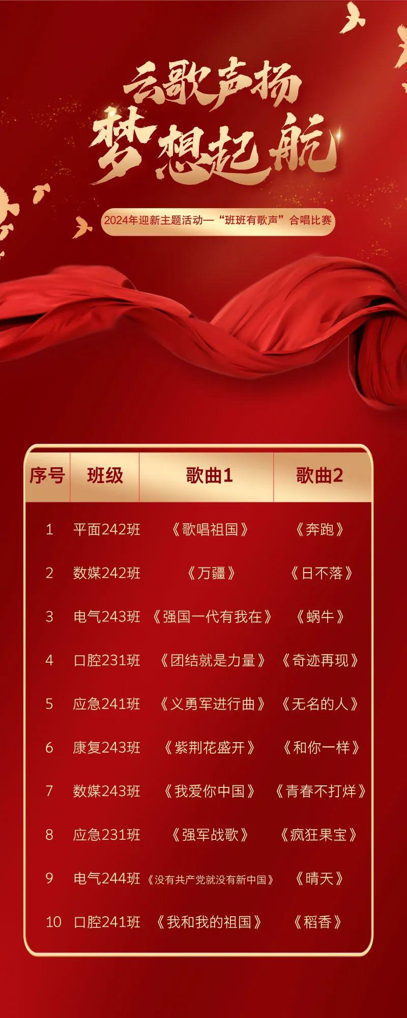 為熱烈慶祝中華人民共和國成立75周年,全面落實立德樹人根本任務(wù),激發(fā)師生愛國熱情,提升學(xué)生藝術(shù)素養(yǎng)和團(tuán)隊協(xié)作精神,同時展現(xiàn)新時代青年的風(fēng)采和活力,10月30日,我校在黃塘校區(qū)與港灣校區(qū)同時舉行了迎新主題活動之“班班有歌聲”合唱比賽。各班合唱團(tuán)以飽滿的熱情和嘹亮的歌聲,傳遞出對祖國的無限熱愛,展現(xiàn)了新時代學(xué)生昂揚(yáng)向上的精神風(fēng)貌。