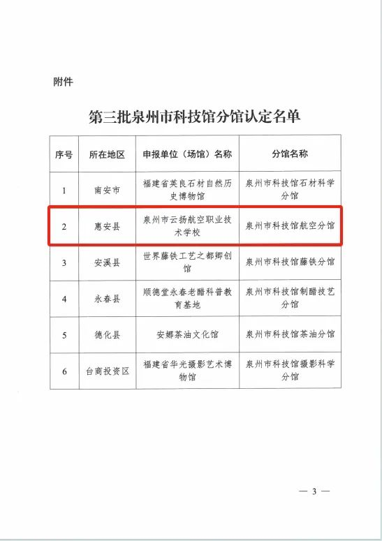 泉州市云揚(yáng)航空職業(yè)技術(shù)學(xué)校投建的云揚(yáng)航空科學(xué)館,是具有航空特色的主題研學(xué)教育科學(xué)館。場(chǎng)館占地面積 5000 多平,內(nèi)設(shè)世界航空史展廳、中國航空史展廳、馬尾航空史展廳、航空科普展區(qū)及無人機(jī)飛行區(qū)。自2024年開館以來,累計(jì)接待游覽、科普研學(xué)、體驗(yàn)等各類人群達(dá) 50000 多人次,并于2024年6月被授予“泉州市黨史教育基地”,2024年10月入選“惠安縣第三批新時(shí)代文明實(shí)踐點(diǎn)”,2024年12月被泉州市科協(xié)認(rèn)定為“泉州市科技館分館”。
