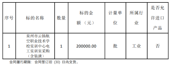 1.項目名稱:泉州市云揚航空職業(yè)技術(shù)學(xué)校實訓(xùn)中心電工實訓(xùn)室采購(含裝潢)