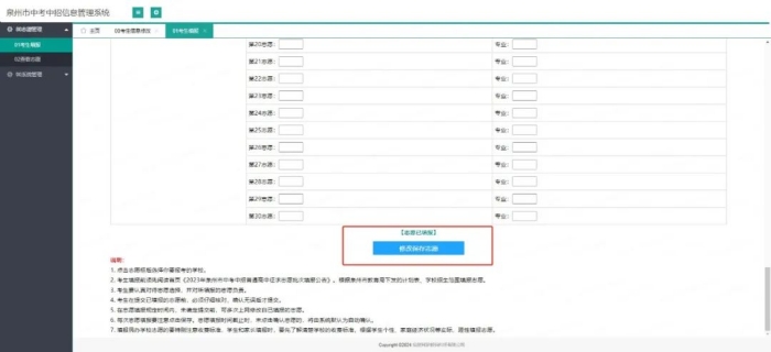 2.補(bǔ)填或更改常規(guī)志愿:普通高中錄取結(jié)束后,有需要的考生于7月22日8:00-7月24日18:00(時(shí)間如有變化,以泉州市中考中招信息管理系統(tǒng)通知為準(zhǔn)),補(bǔ)填三年制中職志愿,或?qū)χ疤顖?bào)的志愿進(jìn)行更改。