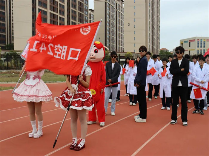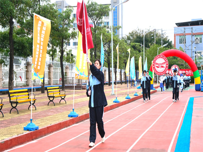 “一二一!一二一!”激昂的口號(hào)劃破晴空,國旗隊(duì)與校旗隊(duì)邁著擲地有聲的步伐率先入場(chǎng)。隊(duì)員們身姿挺拔如松,眼神堅(jiān)定如炬,鮮紅的國旗與校旗在風(fēng)中獵獵飄揚(yáng),不僅彰顯著云揚(yáng)人對(duì)黨和國家的忠誠,更承載著“逐夢(mèng)青春”的初心與擔(dān)當(dāng)——這是開幕式最莊嚴(yán)的序章,也是信仰與榮耀的傳承。