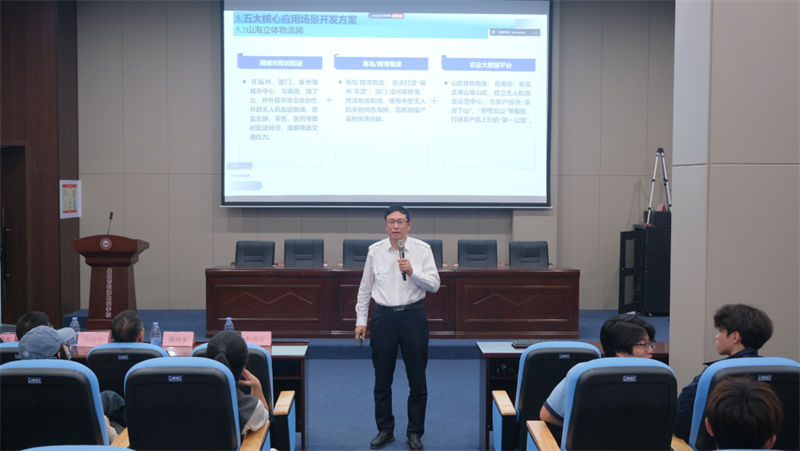 在師生熱烈的掌聲中,遲巖院長(zhǎng)開(kāi)始了主題講座。他結(jié)合云揚(yáng)集團(tuán)在航空領(lǐng)域的實(shí)踐積淀,從政策演進(jìn)、技術(shù)突破與場(chǎng)景應(yīng)用三大維度展開(kāi)分享。在低空無(wú)人機(jī)發(fā)展板塊,他深入解讀了國(guó)家低空空域開(kāi)放試點(diǎn)政策帶來(lái)的行業(yè)機(jī)遇,強(qiáng)調(diào)航空制造技術(shù)升級(jí)對(duì)無(wú)人機(jī)性能提升的核心支撐作用。